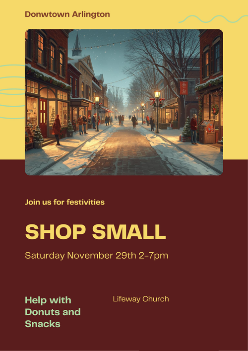 Lifeway Church will be participating in the Downtown Arlington Shop Small event on Saturday November 29 from 2-7pm. We have opportunities to have a craft booth and to help make donuts and help with the movie. Reach out to Eric at eric@arlingtonlifeway.com for more info.