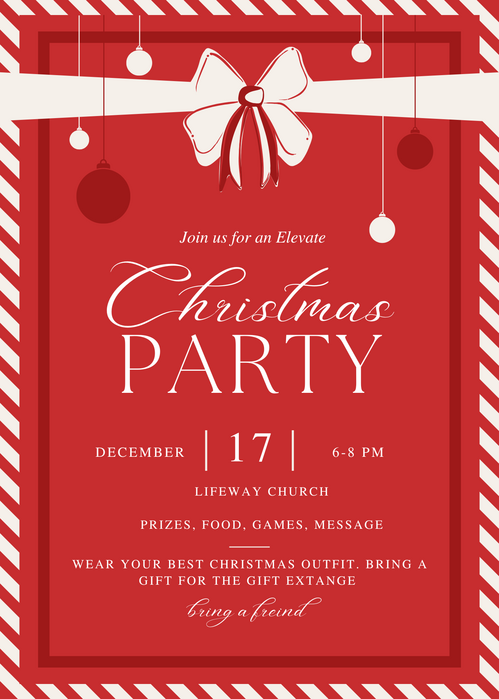 Elevate, join us on Wednesday December 17th from 6-8pm for our annual Christmas party as we celebrate the birth of our savior, Jesus. We will be enjoying fun games, food, prizes and a message. Come wearing your best Christmas outfit and bring a gift valued at $15 or less for the gift exchange.