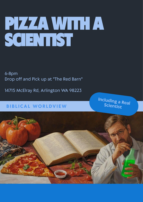 Join us this Saturday 11/22 from 6:00-8:30pm at "The Red Barn" for an evening of pizza, and hearing from a real scientist about biblical matters and how science relates to the biblical worldview.